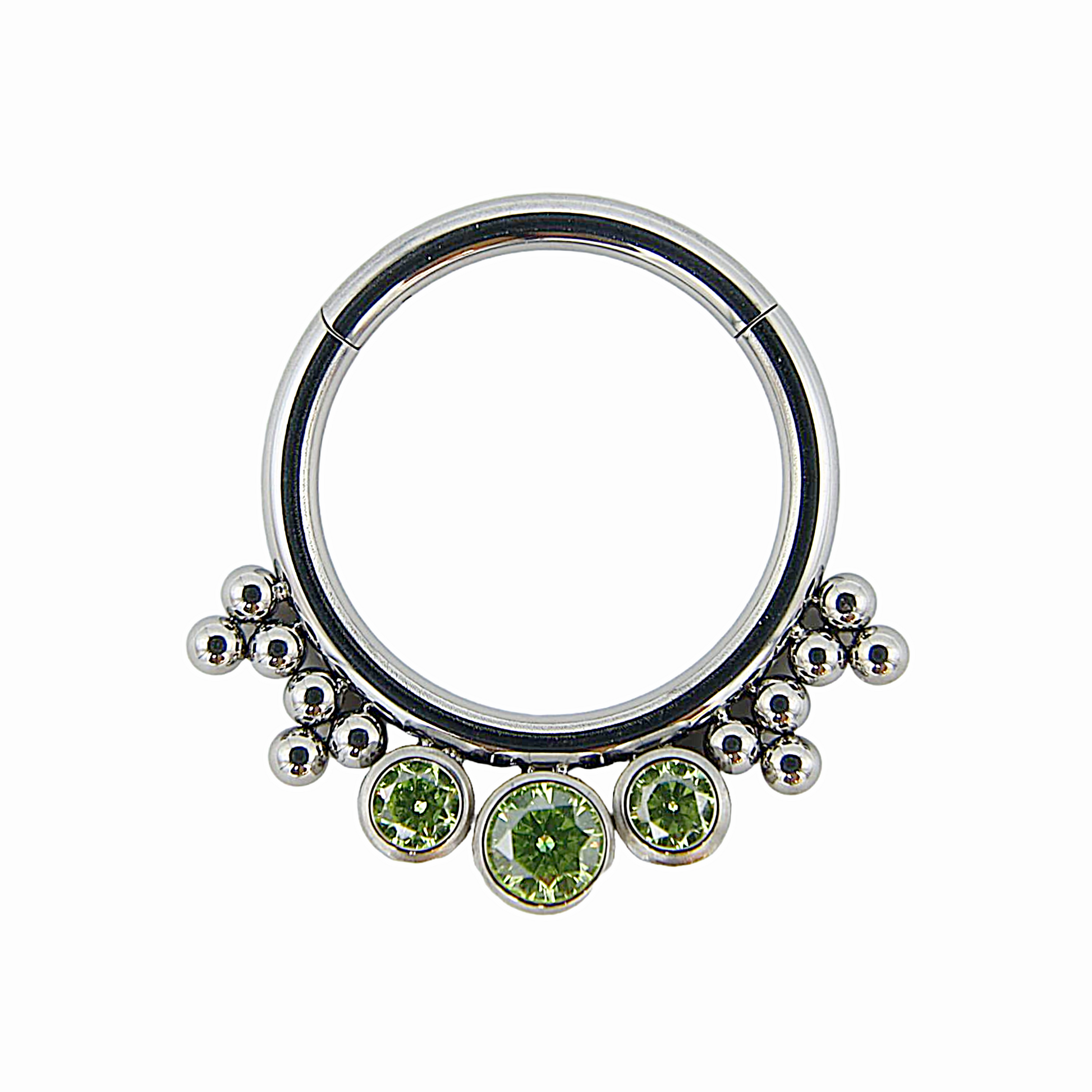 Description fournisseur : ASTM F136 Titanium Hinged segment ring Green CZ